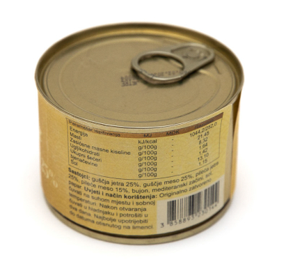 Delikatesni namaz izrađen od pomno odabranih sastojaka: guščje i pileće jetre (ukupno 50%),